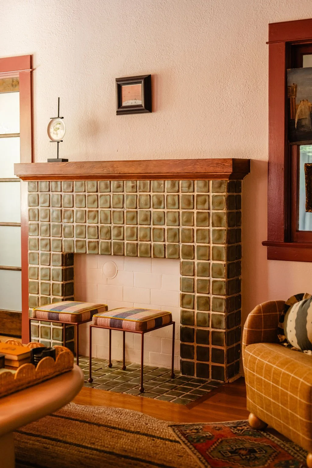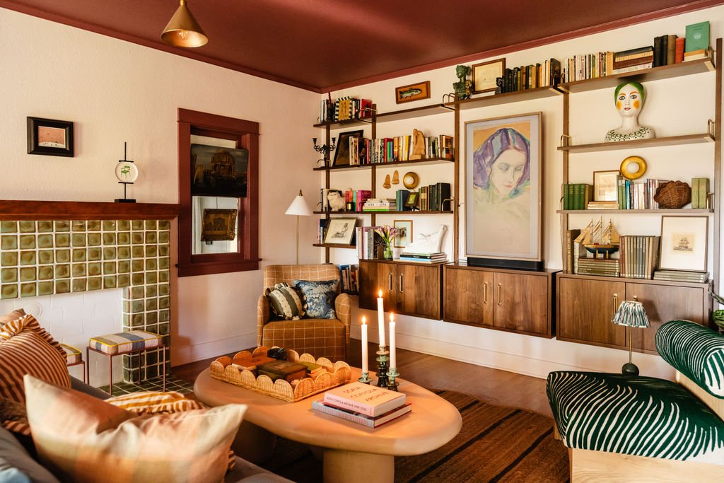 Living and dining rooms in 1920s Spanish style Eagle Rock bungalow.